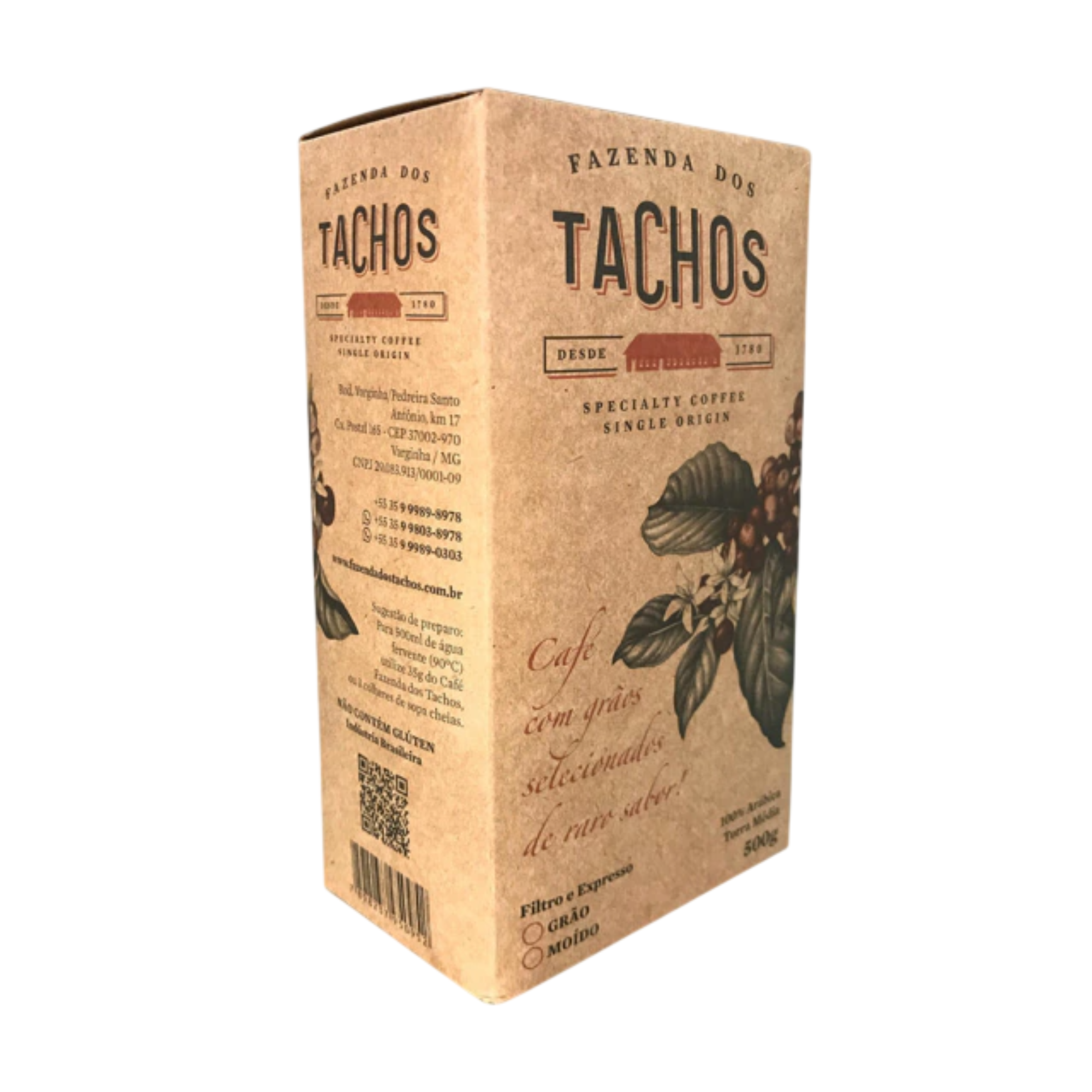 O Café Fazenda dos Tachos é produzido desde 1780, mantendo viva a tradição artesanal que atravessa gerações. Este café gourmet 100% arábica, com pontuação 84+, apresenta torra média e um equilíbrio perfeito entre doçura, corpo e acidez. Cada xícara revela o sabor autêntico de um café mineiro de alta qualidade.